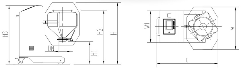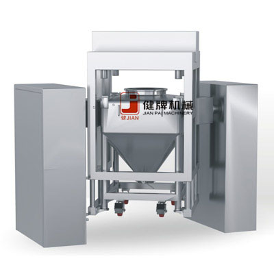 該機由機座、驅(qū)動系統(tǒng)、控制系統(tǒng)、混合料斗等部件組成。工作時,將 物料加入料斗后,鎖緊料斗蓋,按照工藝要求設(shè)定混合時間、混合速 度,啟動控制系統(tǒng),,即可開始混合工作,到設(shè)定的時間后,整機垂直 停止,混合結(jié)束。